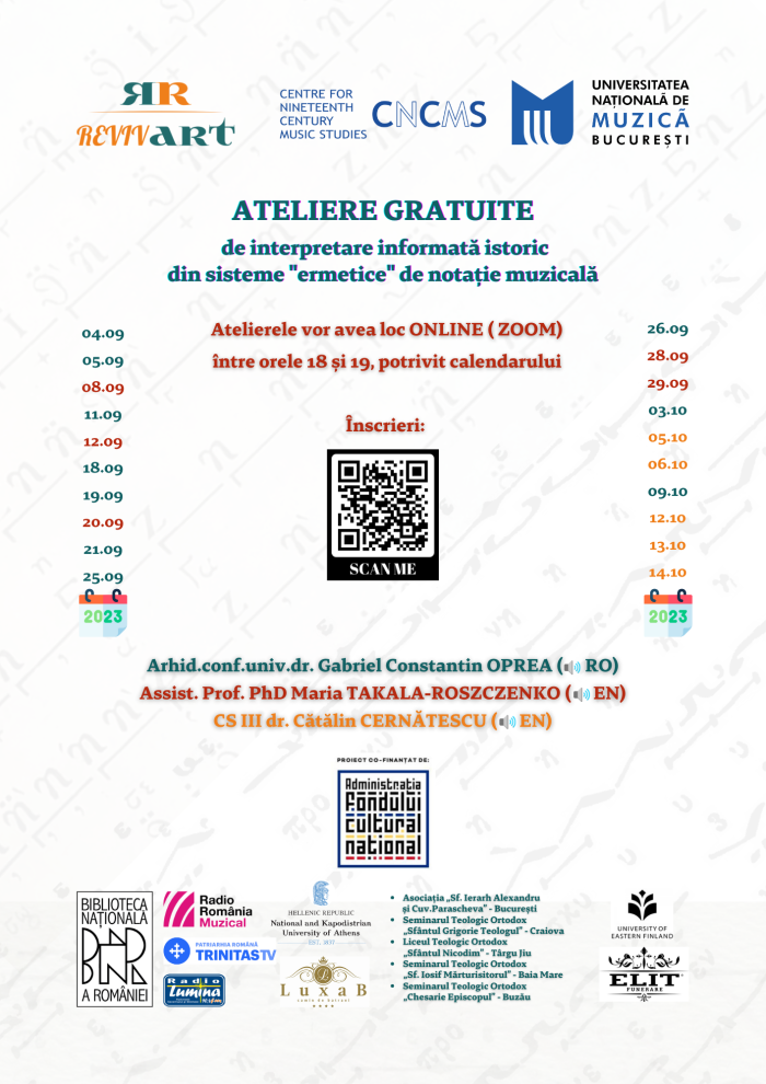 🏛️Universitatea Națională de Muzică din București (UNMB), în parteneriat cu Facultatea de Teologie a Universității din Finlanda de Est (UEF), Universitatea Națională și Kapodistriană din Atena (ΕΚΠΑ) și Asociația REVIVART, organizează între 4 septembrie și 14 octombrie 20 de ateliere de interpretare informată istoric din sisteme greu accesibile de notație muzicală.
